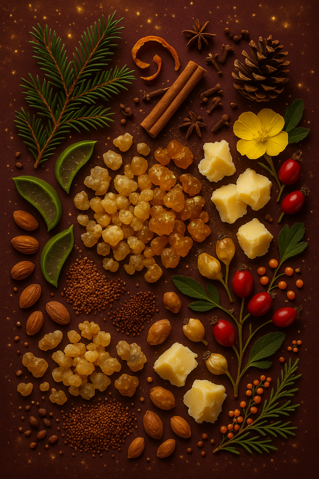 Castor oil, Jojoba oil, Amaranth seed oil, Argan oil, Apricot kernel oil, Seabuckthorn oil, Vitamin E, Essential oils (Lavender, Patchouli, Tea Tree, Geranium, Rosemary), Frankincense essential oil, Myrrh essential oil. All Organic.