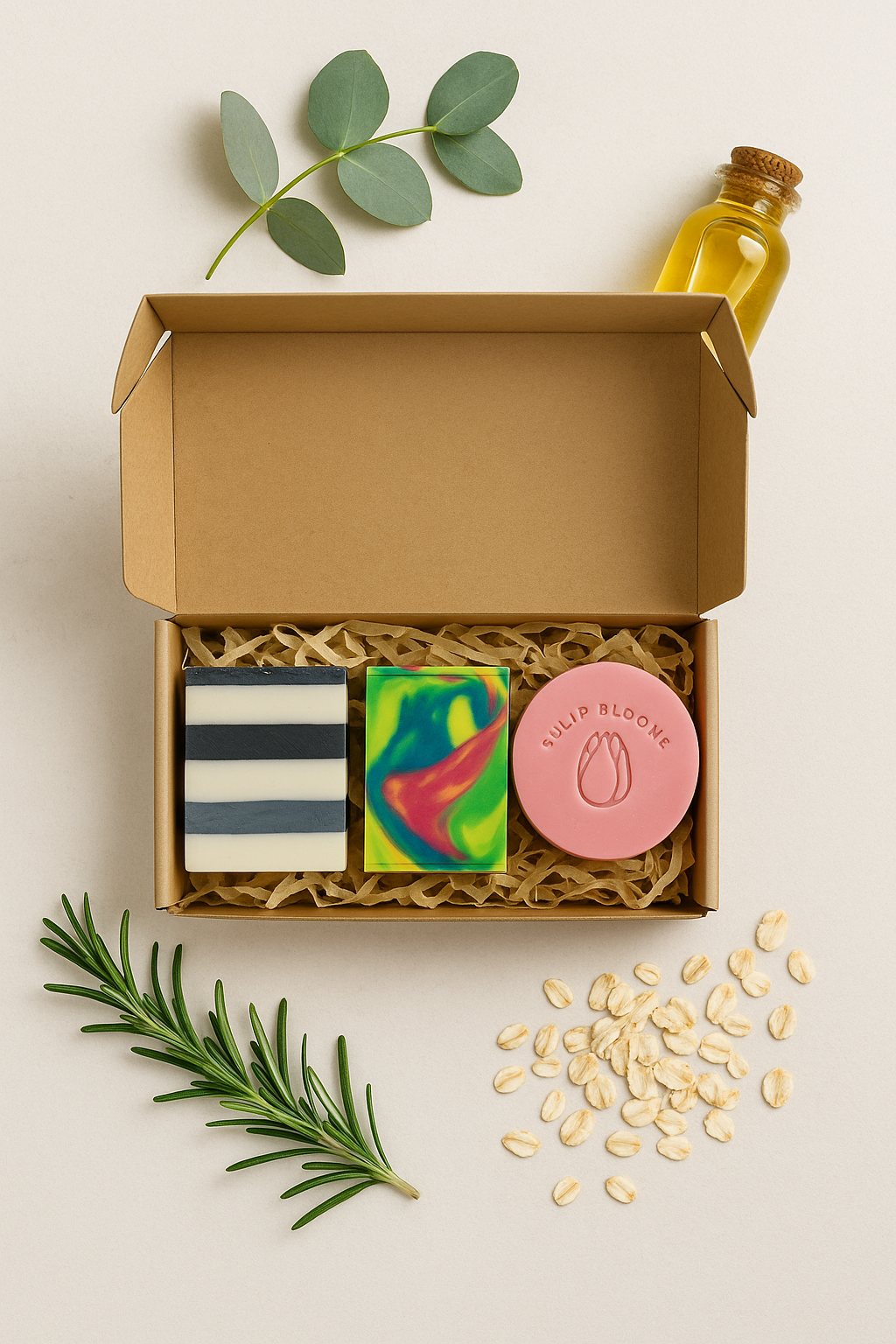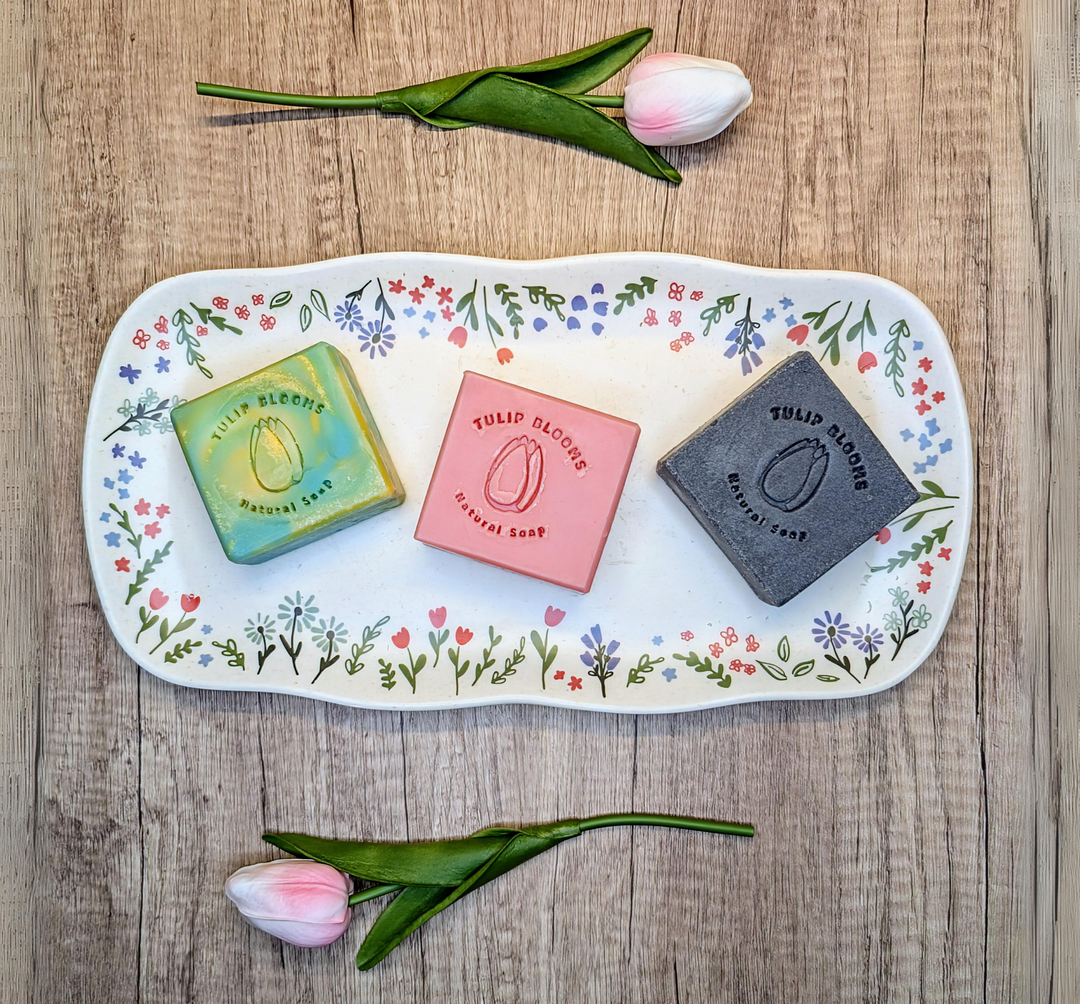 Three different Tulip Blooms soaps, thoughtfully hand-selected to keep things fun and fresh. No two surprise boxes are exactly the same.