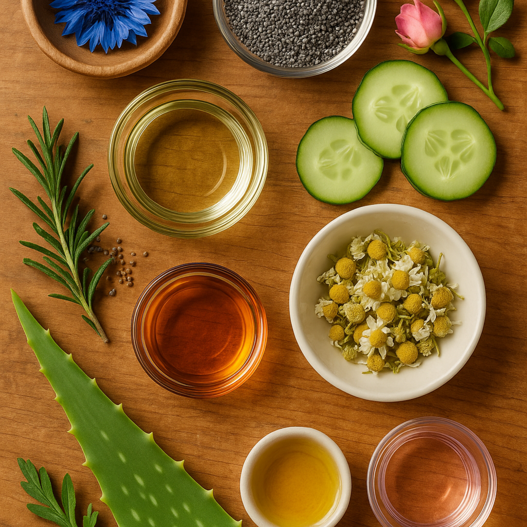Each product is handmade in Texas using clean, natural ingredients like aloe vera, perilla oil, chamomile, mango butter, blue tansy, and bakuchiol to deeply hydrate, restore balance, and enhance your natural glow.