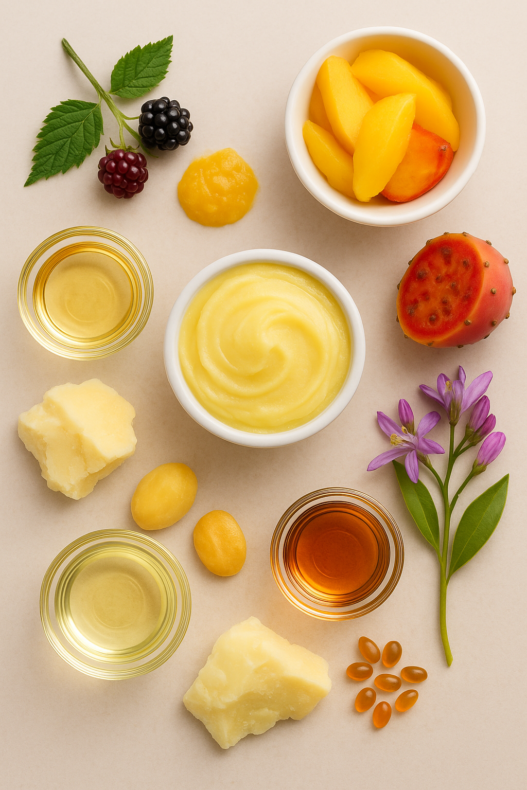 Mango Butter, Babassu Oil, Plum Kernel Oil, Red Raspberry Seed Oil, Amaranth Oil, Prickly Pear Seed Oil, Bakuchiol, Cetyl Alcohol (plant-derived), Candelilla Wax, Vitamin E (Tocopherol), Neroli Essential Oil